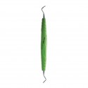 Sickle scaler CI 2/3, with large facial surfaces matched to tooth contours for removing massive accumulations of dental plaque or plastic, cement, or adhesive residues from all interdental spaces, yellow-green.